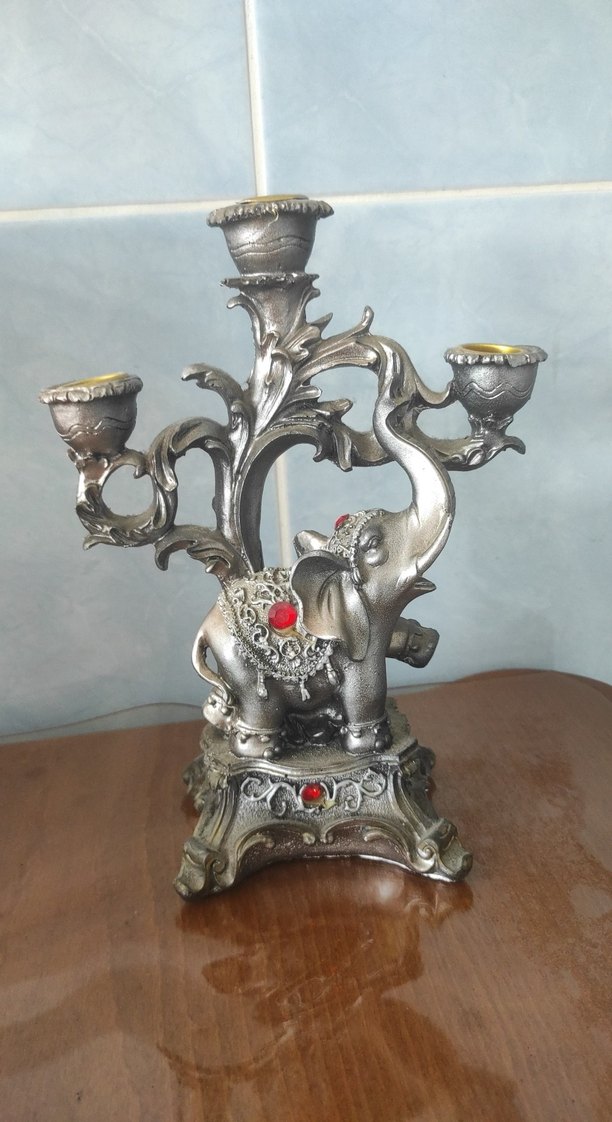 Kırmızı detaylı gri fil figürlü, üç kollu dekoratif mumluk. ️