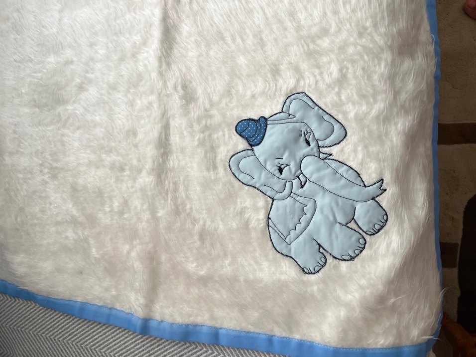 Yumuşak, mavi şapkalı sevimli fil figürüyle, sarılmak için ideal .Hiç kullanılmadı. Etiketi mevcut değil. Bazı yerlerde ufak lekeler var