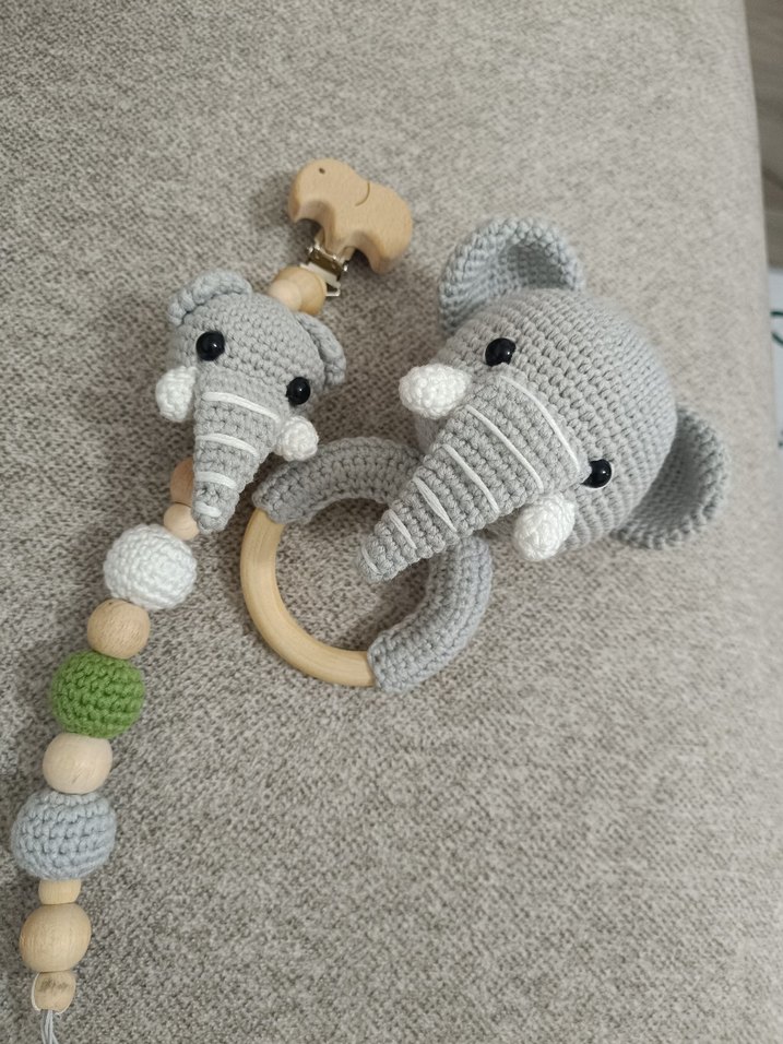 Yumuşak tığ işi gri fil figürlü diş kaşıyıcı ve çıngırak, ahşap boncuklar ve kolay takılabilen klips içerir. (istenilen renkte sipariş alınır)