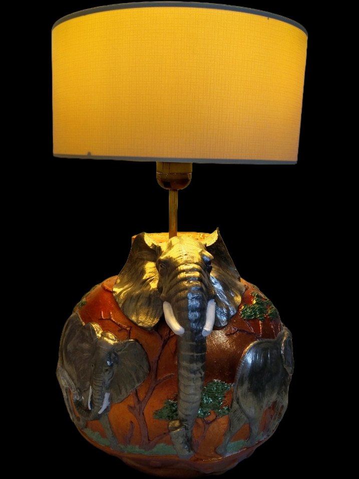 Üzerinde fil figürleri ve ağaç desenleri bulunan, üstünde lamba aparatı olan gri renkli dekor .şapkasız göndericektir .