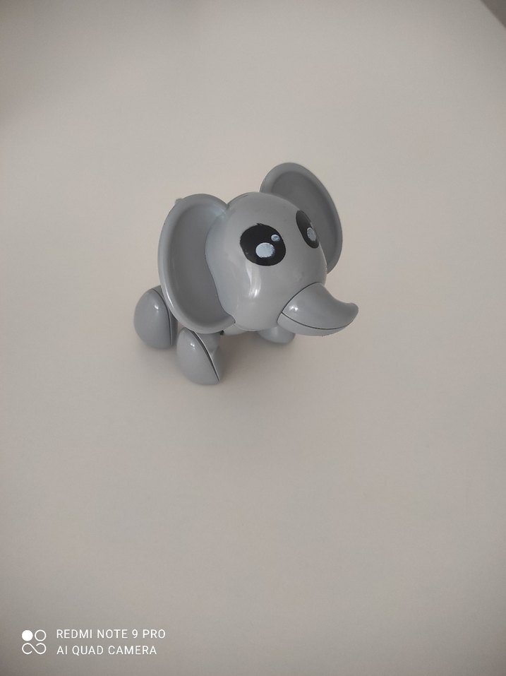 Gri renkli fil figürü, parlak yüzeye ve çizgi film tarzı gözlere sahip küçük bir oyuncak. baş kısmı ve ayakları el ile dönüyor