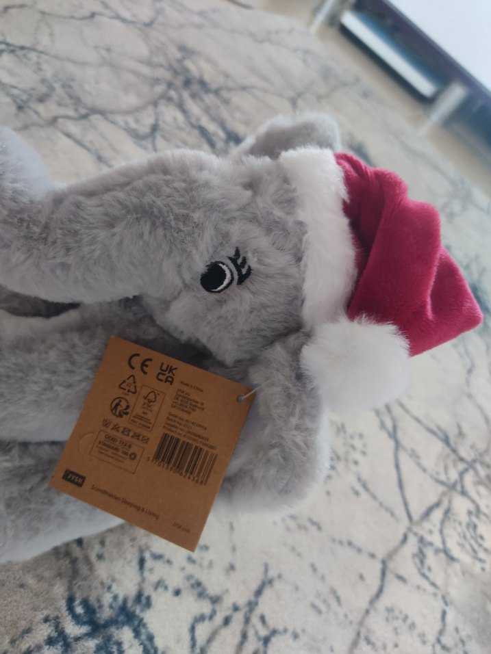 Yumuşak gri peluş fil oyuncak, kırmızı Noel şapkası ile süslenmiş. 20cm