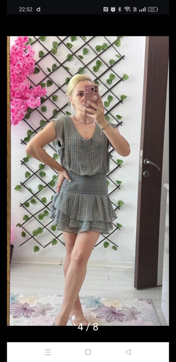 Kolsuz, V yaka ve fırfırlı detaylara sahip bol kesim mini elbise. Gri batik desenli ve yumuşak sentetik kumaştan, günlük kullanım için uygun.