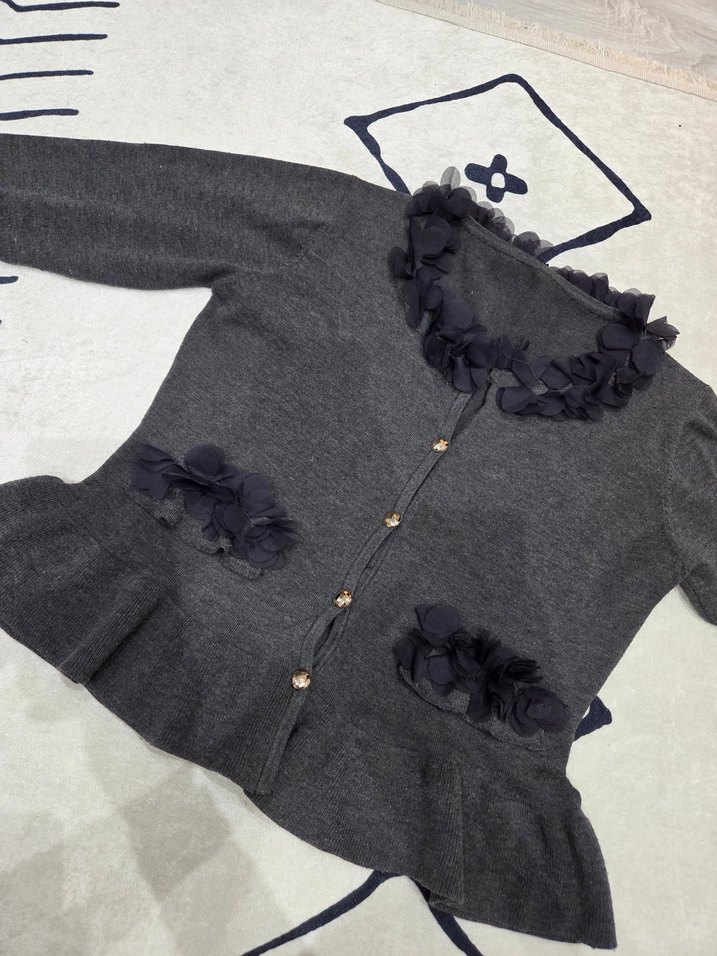 Gri renkte, uzun kollu, triko kumaştan yapılmış, yakasında ve ceplerinde işleme fırfır detayları bulunan, normal boyda ve bol kesim kadın hırkası.