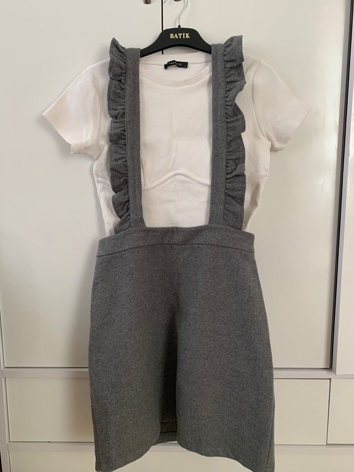 Gri fırfırlı askıları ve kısa kollu bisiklet yaka üstüyle, sentetik kumaştan yapılmış, dar kesim mini salopet. Trendy günlük sokak stili için uygun.