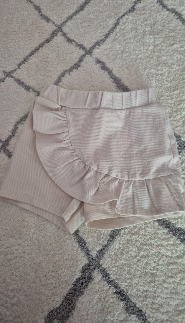 Gri pamuk kumaştan, fırfır detaylı, bol kesim mini şort. Kısa boy ve desensiz, günlük sokak stili için uygun. 3-4 yaş