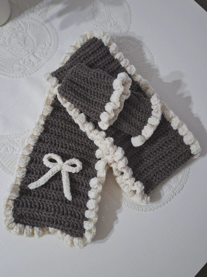 Gri örgü kadın Atkı ve eldiven beyaz fırfır detayları ve fiyonk süslemeye sahip, sıcak ve klasik bir tarza sahiptir. İsteğe göre farklı renklerde sipariş alınır