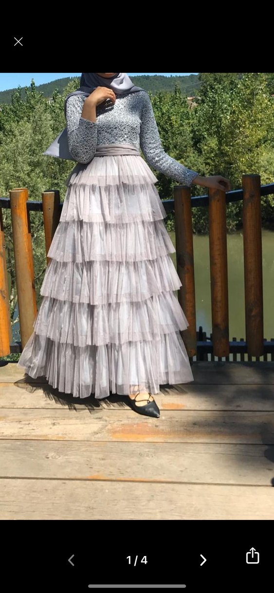 Gri renkli, bağlamalı desenli ve çok katlı fırfırlı uzun etek, yumuşak sentetik kumaştan, düzenli kesimle üretilmiştir. Düğünler için bohem ve modaya uygun bir seçimdir.