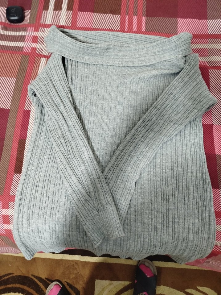 Bu gri fitilli kadın kazak, straplez ve uzun kolludur. Yumuşak örme kumaştan yapılmış, uzun boy ve desensiz sade tasarıma sahiptir. Günlük rahat kullanım için uygundur.