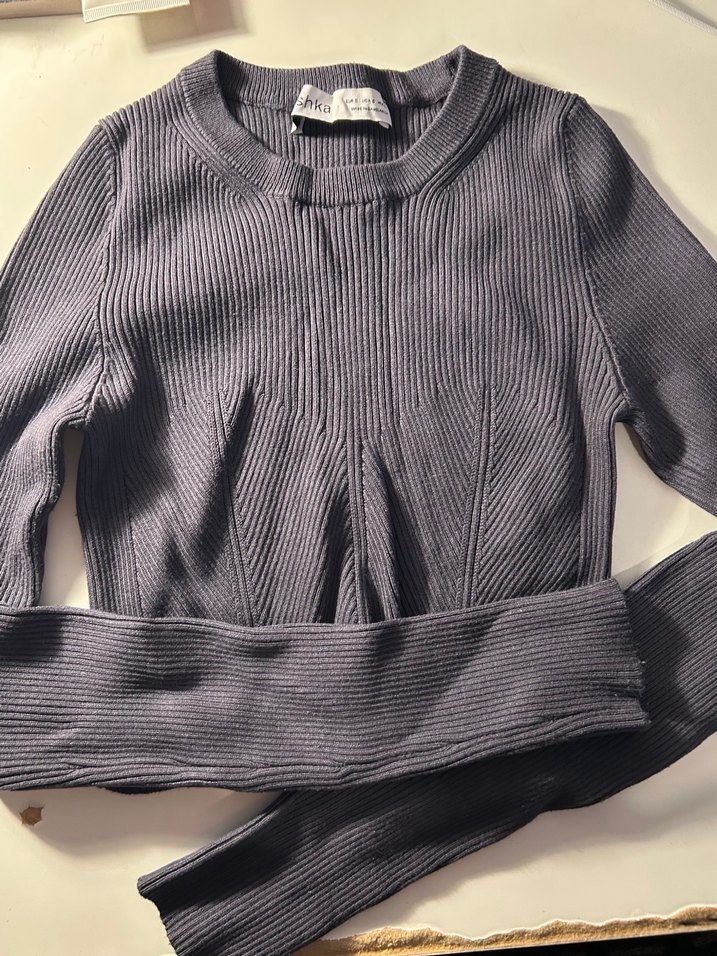 Gri renkte, fitilli örgü dokusuna sahip, bisiklet yaka ve uzun kollu kadın triko kazak. Midi boyda ve desen içermeyen sade tasarım, günlük kullanıma uygun.