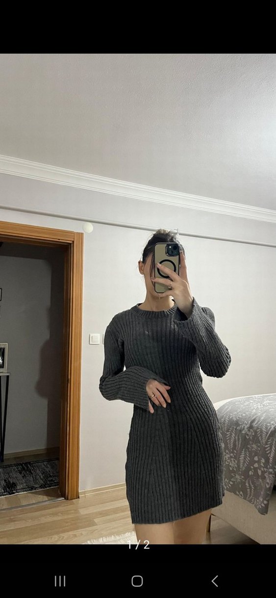 Gri fitilli triko midi elbise, uzun kollu ve yüksek yakalı, rahat ve sade normcore tarzıyla günlük kullanıma uygundur.
