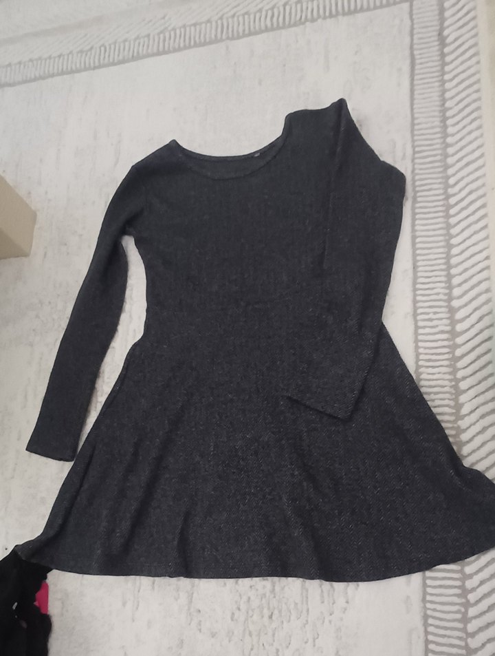 Gri renkli, uzun kollu, yuvarlak yakalı ve fitilli triko kumaştan yapılmış mini elbise. Rahat ve sade tasarımıyla günlük kullanıma uygundur.