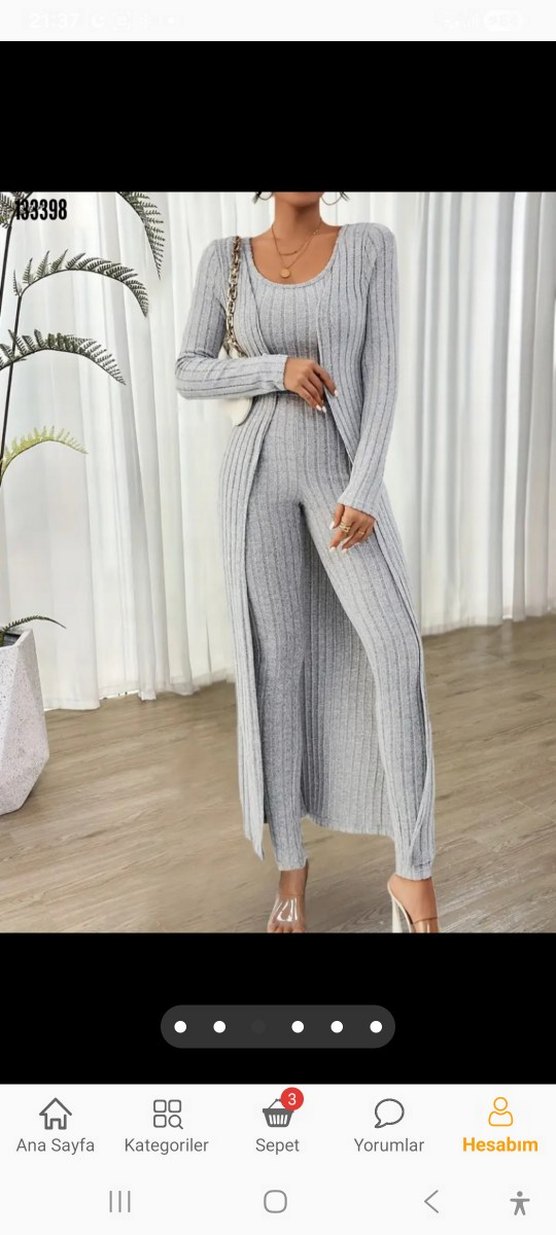 Gri renkte, uzun kollu ve yuvarlak yakalı, fitilli triko kumaştan yapılmış uzun, vücuda oturan tulum. Günlük kullanıma uygun, rahat ve sade tarzda.