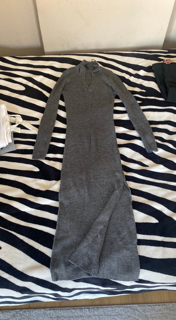 Yüksek yakalı, uzun kollu, gri renkte, yumuşak sentetik kumaştan örme dokulu, fit kesim uzun elbise. Sokak stiline uygun rahat ve şık. 120 cm uzunluğunda yırtmaçlı ama yırtmavı aşırı yukarıda değil (100 tl altı tek ürün alımı kargolanmayacaktır)