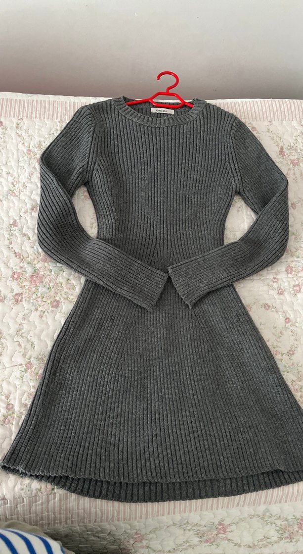 Gri renkli, uzun kollu ve yuvarlak yakalı fitilli triko elbise. Yumuşak örme kumaştan yapılmış, sade ve uzun kesim, günlük kullanıma uygundur.