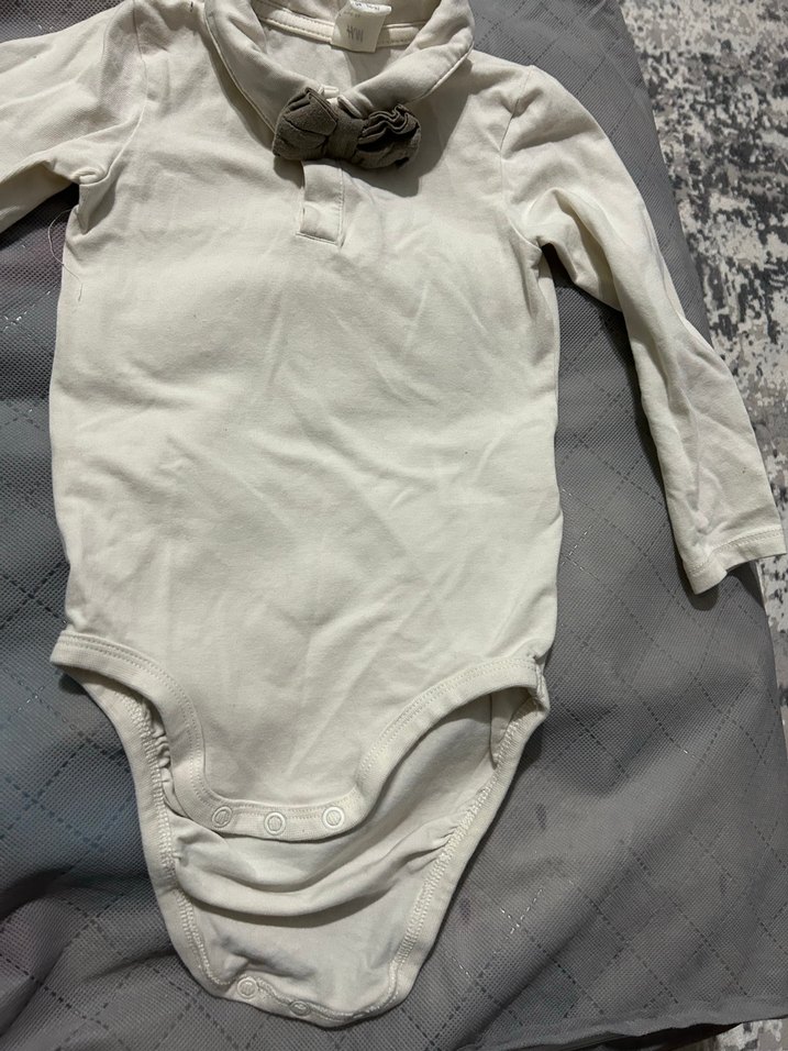 Gri fiyonk detaylı,uzun kollu beyaz bebek zıbını. Yumuşak ve rahat kumaştan üretilmiştir. Lekesiz ve defosuzdur