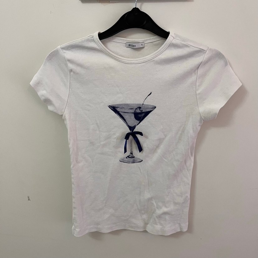 Beyaz, kısa kollu ve bisiklet yaka kadın tişörtü, gri fiyonk detaylı kokteyl baskısına sahip, yumuşak sentetik kumaştan üretilmiştir.