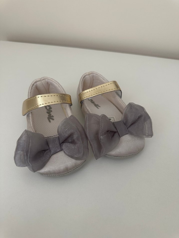 Gri tie-dye desenli kız babetleri, büyük fiyonk ve altın renkli bant ile klasik şıklığı çağdaş tarzla birleştirir. Kauçuk tabanlıdır.