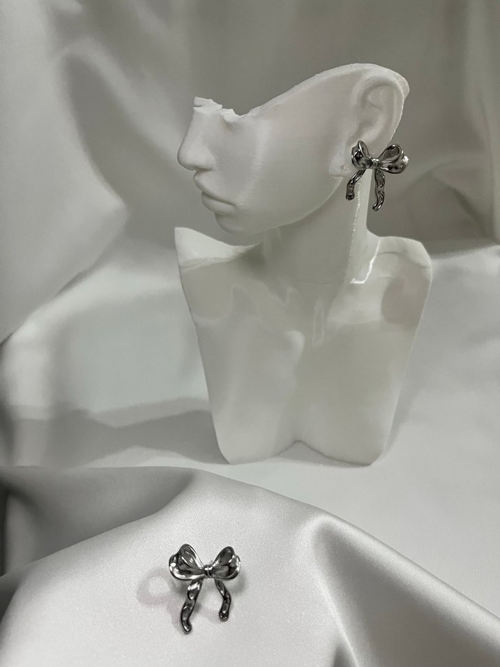 Gri renkli, kısa uzunlukta, fiyonk detaylı mini kadın küpeleri. Günlük kullanım için uygun, desen içermeyen çağdaş tasarım.