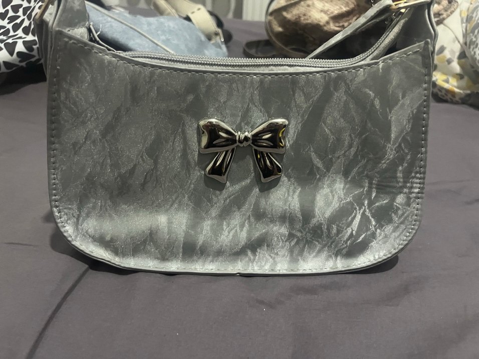 Gri baskılı sentetik kumaştan yapılmış, metalik fiyonk detayıyla klasik zarafet ve gotik stil bir arada.
