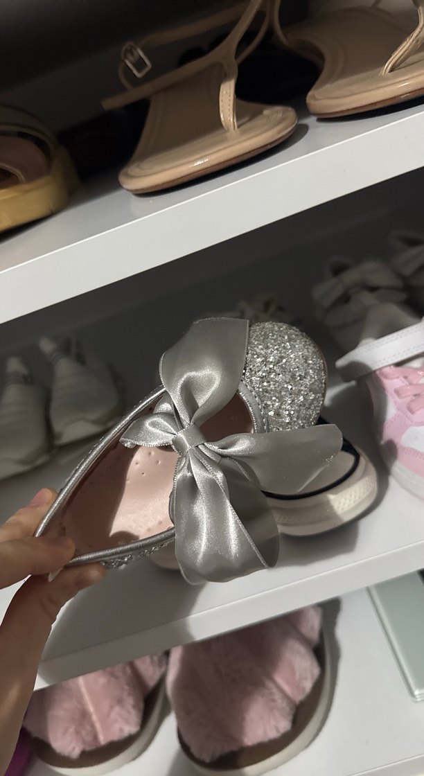 Gri renkli, parlak fiyonk detaylı ve simli topuklu kız babet ayakkabı, kauçuk malzemeden üretilmiştir.✨