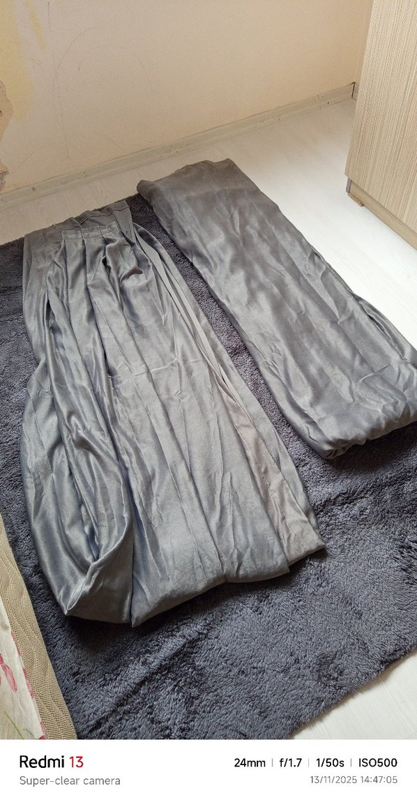 koyu gri antrasit arası fon perde hasarı yok en üst korniş yeri 93 cm uzunluğu da 270 cm ikisinin fiyatı bağlama ipleri de mevcut isteyene duvara takılan taşlı tutacağı da veririm