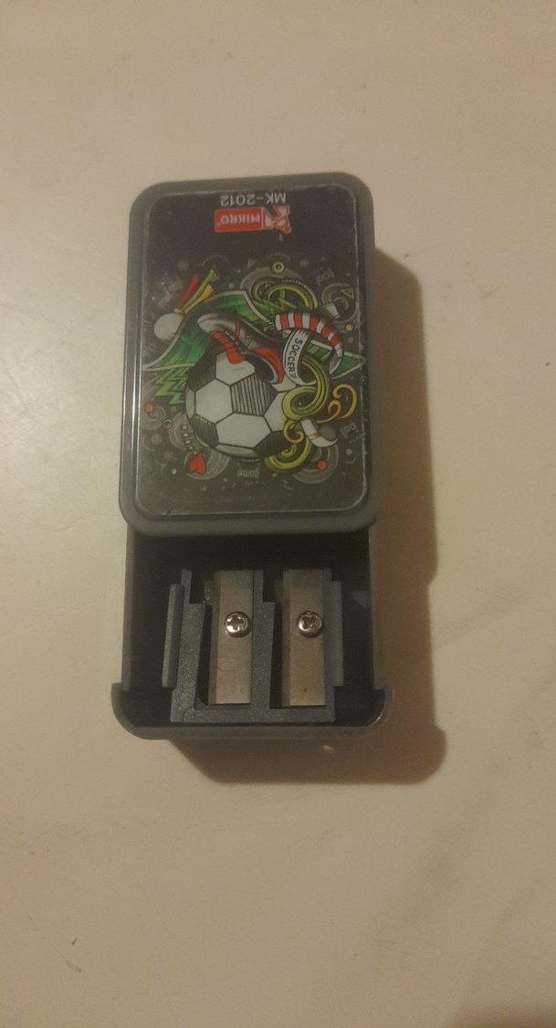 Üzerinde futbol temalı desen bulunan gri çift delikli kalemtraş, kalemleri hassas şekilde açmak için uygundur. ⚽