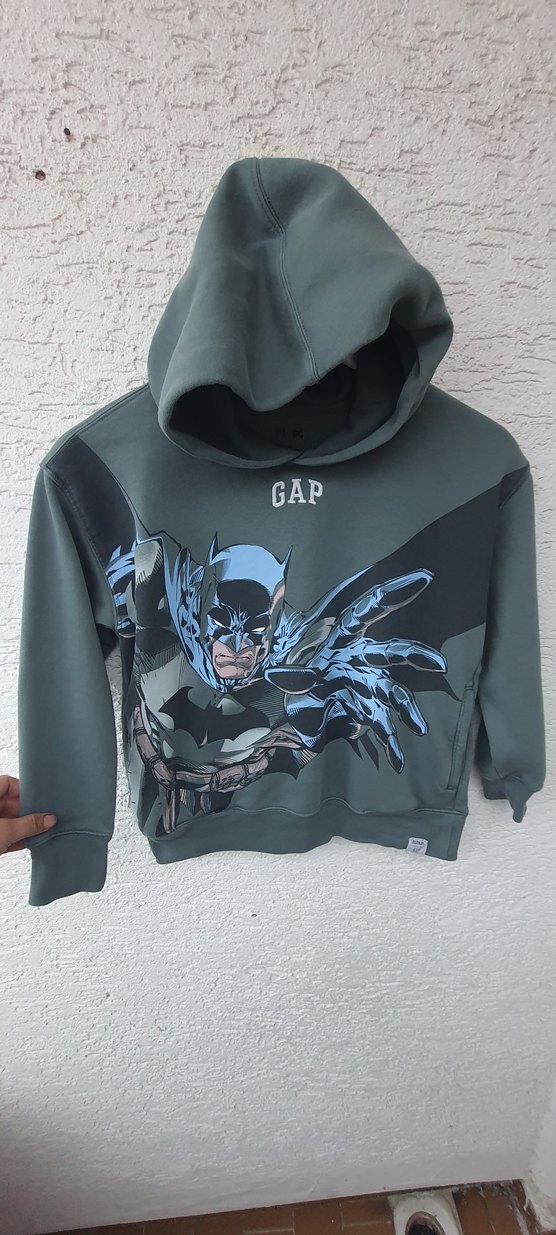 Gri renkte, baskılı Batman figürlü, kapüşonlu ve fermuarlı GAP marka, pamuksu yumuşak kumaştan yapılmış, uzun kollu ve dar kesim erkek çocuk sweatshirtü. ölçüleri resimlerde mevcut