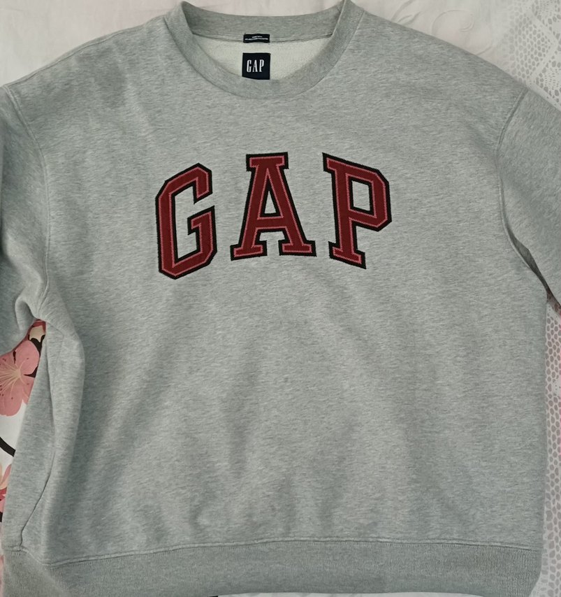 GAP markalı, %14 geri dönüştürülmüş polyester içeren gri erkek rozetli sweatshirt, rahat sokak stili için uygundur.