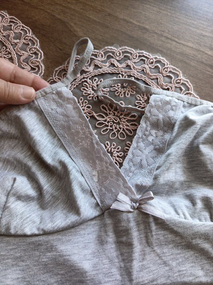 Gri renkte,V yaka dantel süslemeli, ince askılı, normal boyda gecelik hiç kullanılmadı xxl yazıyor ama XL bedene daha uygun olacaktır likralı kumaş #gecelik#elbise