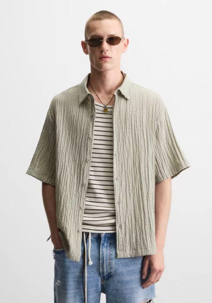Bu erkek gömleği kısa kollu ve kayık yaka detayına sahiptir. Yumuşak gofri kumaştan üretilmiş, pileli dokusu ve haki rengiyle günlük rahat kullanıma uygundur. 2 kez kullanıldı.