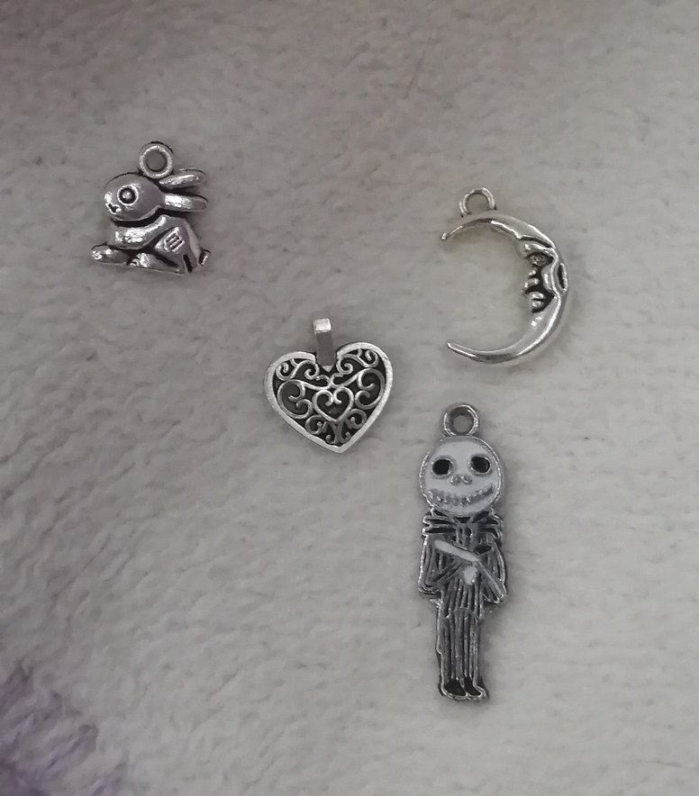 Gri renkte, tavşan, hilal, desenli kalp ve iskelet figürlü dört gotik tarzda boncuklu kadın charm seti. Romantik akşamlar için uygun.