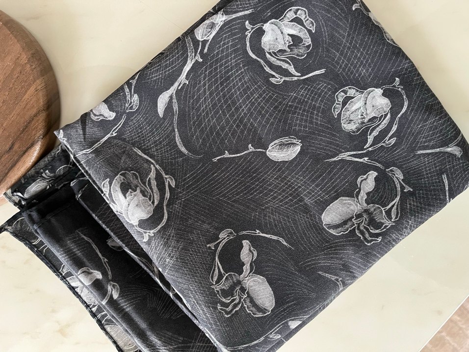 Gri renkte, gotik çiçek desenli, yumuşak sentetik kumaştan drapeli kadın şalı. Paris tarzında avant-garde bir görünüm sunar.