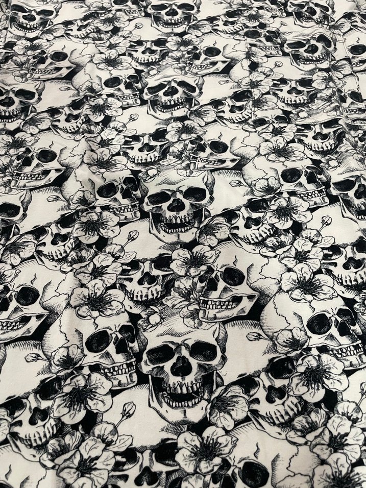 Koyu gri, gotik tarzda baskılı kafatası ve çiçek desenlerine sahip masa örtüsü, masanıza farklı bir hava katıyor.