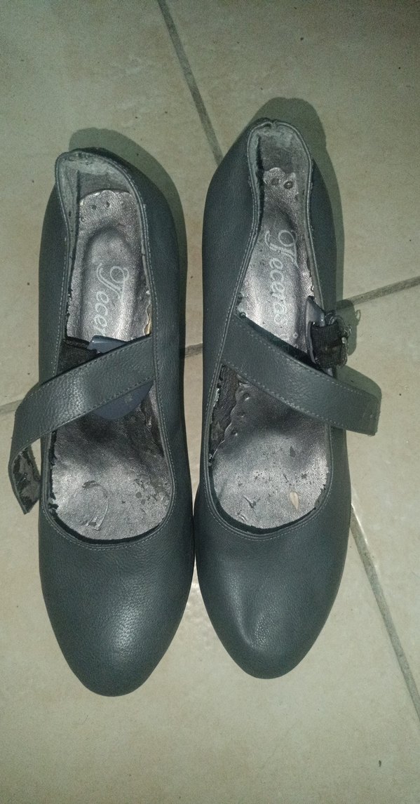 Gri renkte, dolgu topuklu ve tokalı kayışlı, lastik malzemeden kadın abiye ayakkabısı. Gotik tarzda, şık ve yenilikçi görünüm için uygundur.
