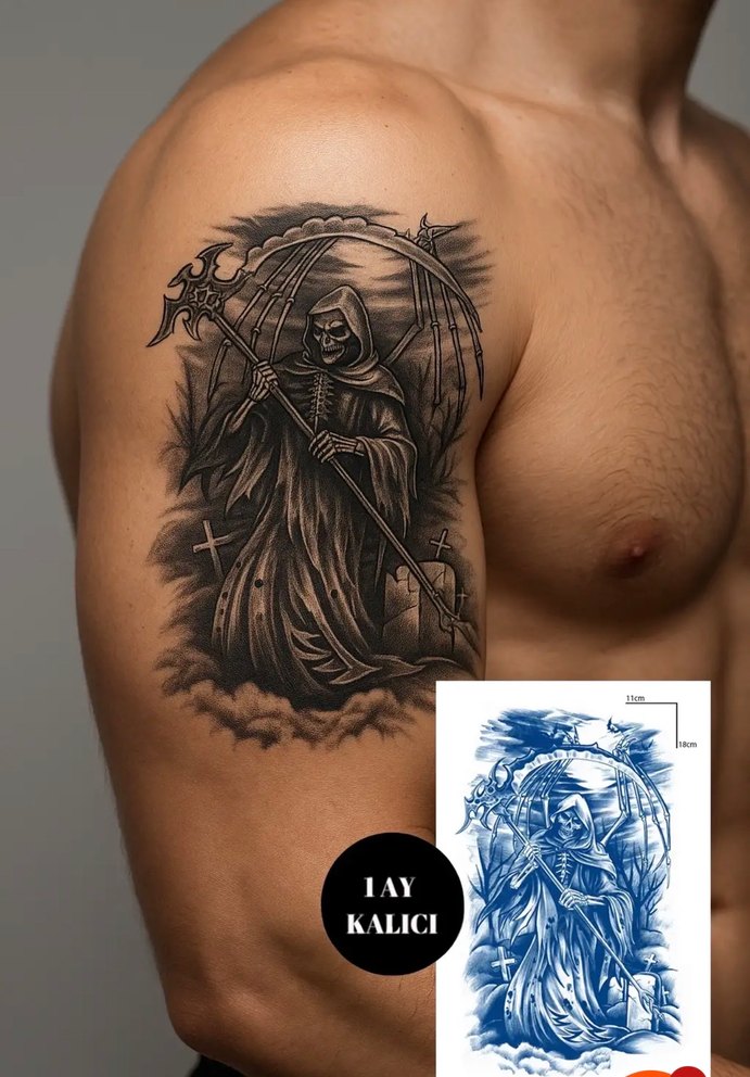 Koyu gölgelerle vurgulanan gri gotik tarzda Grim Reaper dövme tasarımı. Kalıcı ve katmanlı yapısıyla dikkat çekici. ⚰️