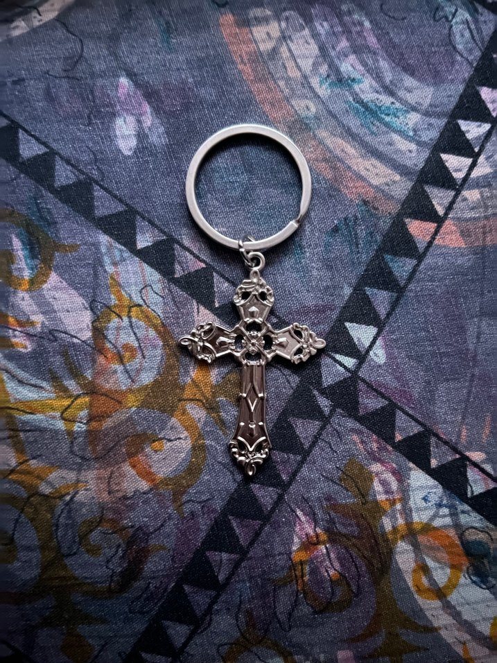 Detaylı desenlere sahip gri gotik haç anahtarlık ya da kolye ucu olarak kullanılabilir. Bohem ve retro tarzlara uygundur, metal malzemeden yapılmıştır.