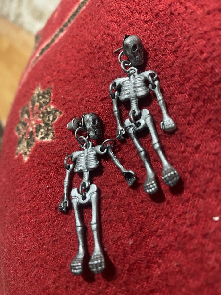 Gri renkte, kafatası figürlü, gotik tarzda, tokalı midi uzunlukta küpeler. Rock punk havası ve romantik akşamlar için uygun.