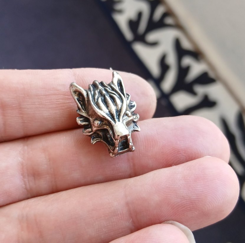 Bu erkek yüzüğü, gotik ve rock punk havasını yansıtan detaylı gri kurt başı tasarımına sahiptir.