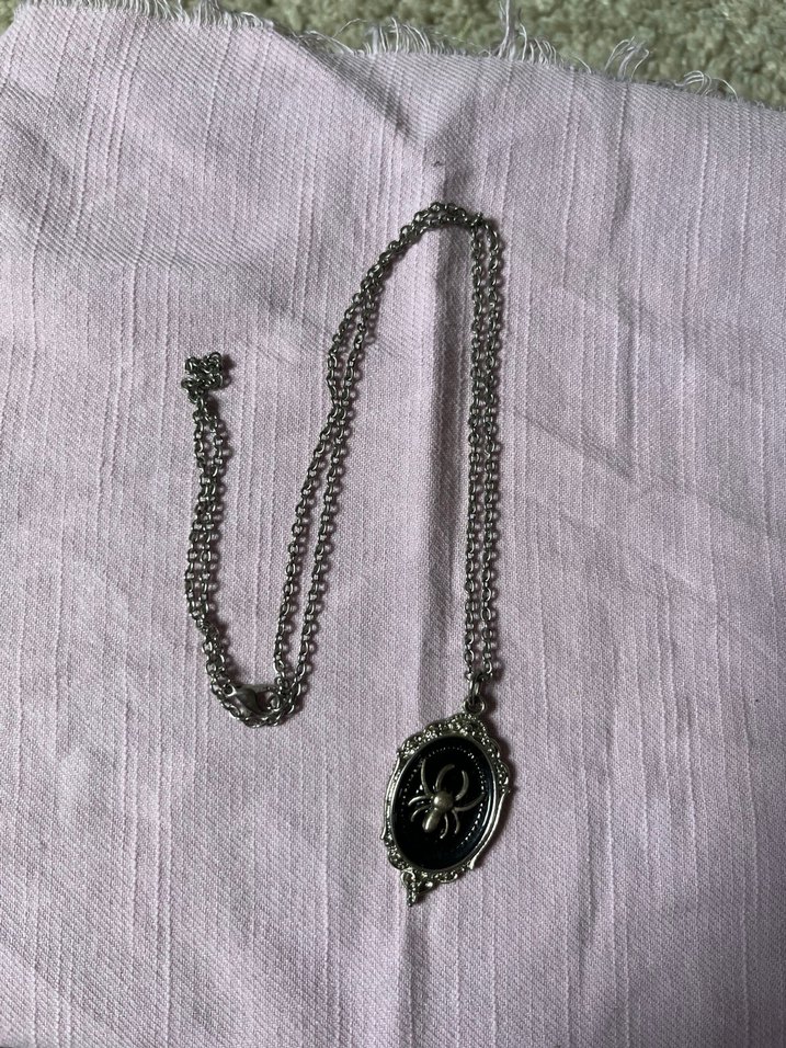 Gri renkte, zincir detaylı gotik tarzda, örümcek işlemeli midi uzunlukta kolye. Günlük kullanıma uygundur. ️
