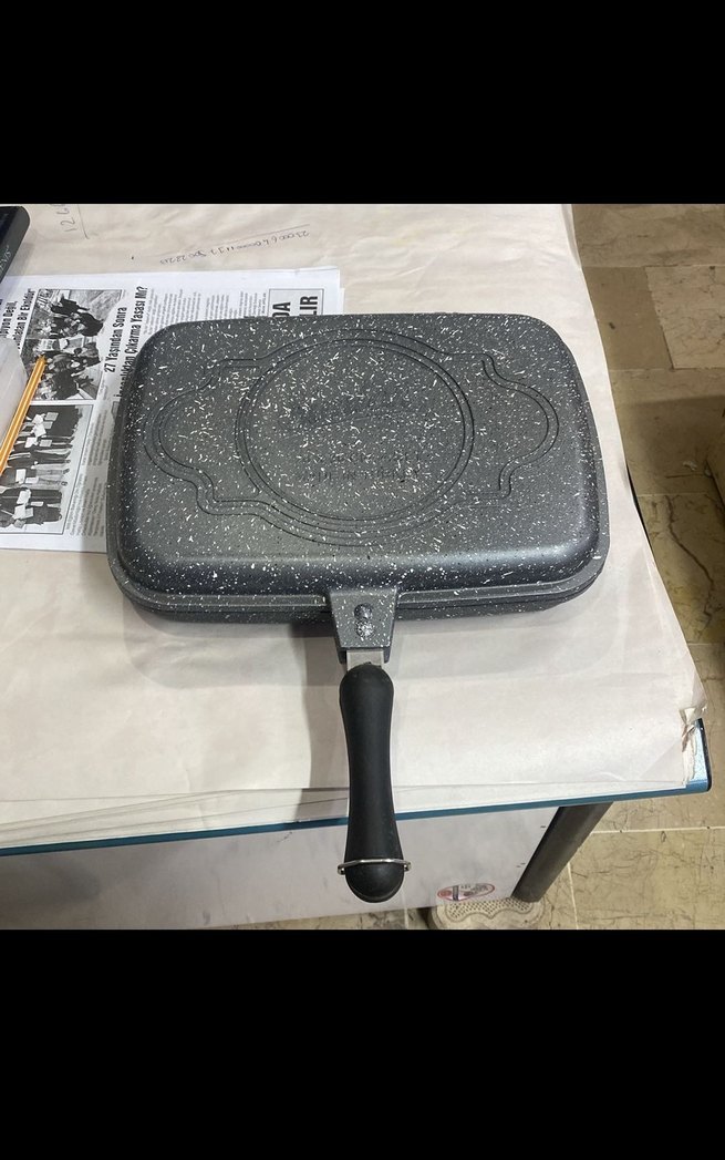 Gri granit kaplamalı, çift taraflı kullanıma uygun, tutma sapı siyah olan tava. Çok yönlü pişirme için uygundur.