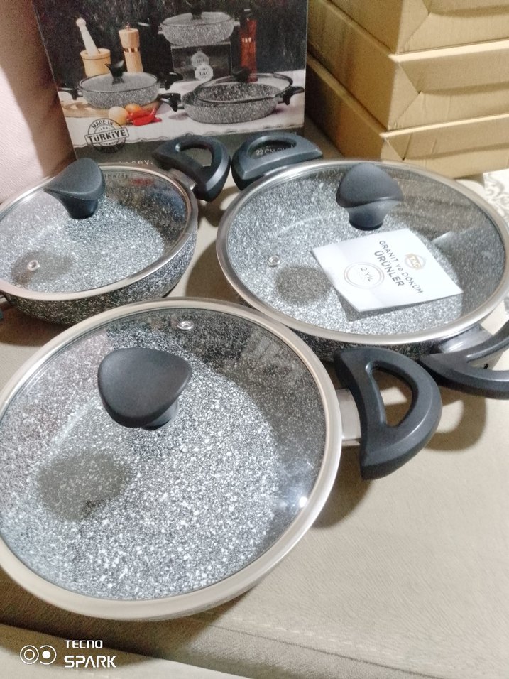 iade yoktur Gri ultra granit yüzeye sahip, taç marka omlet seti 18 20 22 cm formlarında bakalit tutaçlara sahip