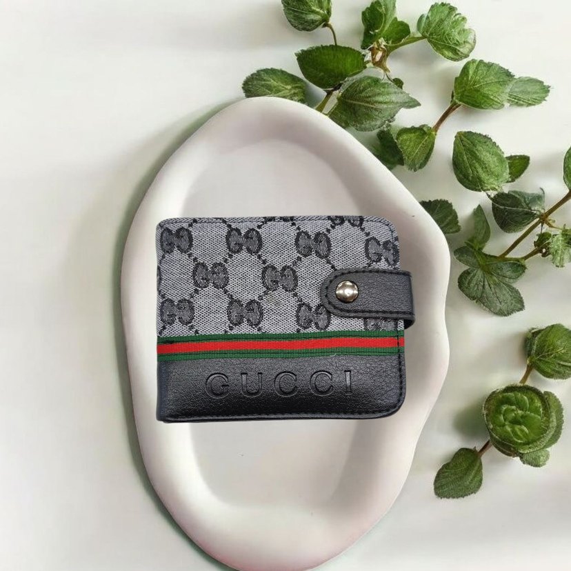 Gri baskılı desene sahip, siyah deride Gucci logosu bulunan erkek cüzdanı. Düğmeli kapanışlı, sokak modası ve Paris etkisi taşıyor.
