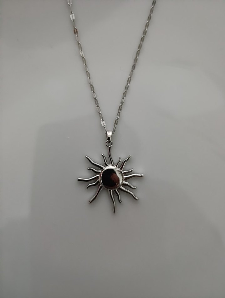 Gri zincir ve güneş şeklinde kolye ucu ile günlük kullanıma uygun minimalist ve bohem tarzda kadın kolyesi.