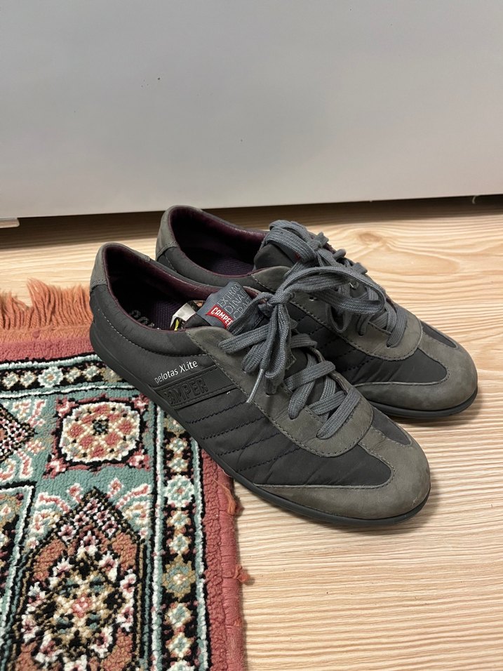 Gri renkli, ve bağcıklı kapamaya sahip erkek spor ayakkabısı. Kauçuk tabanlı, günlük ve sokak tarzı için uygundur. ♂️