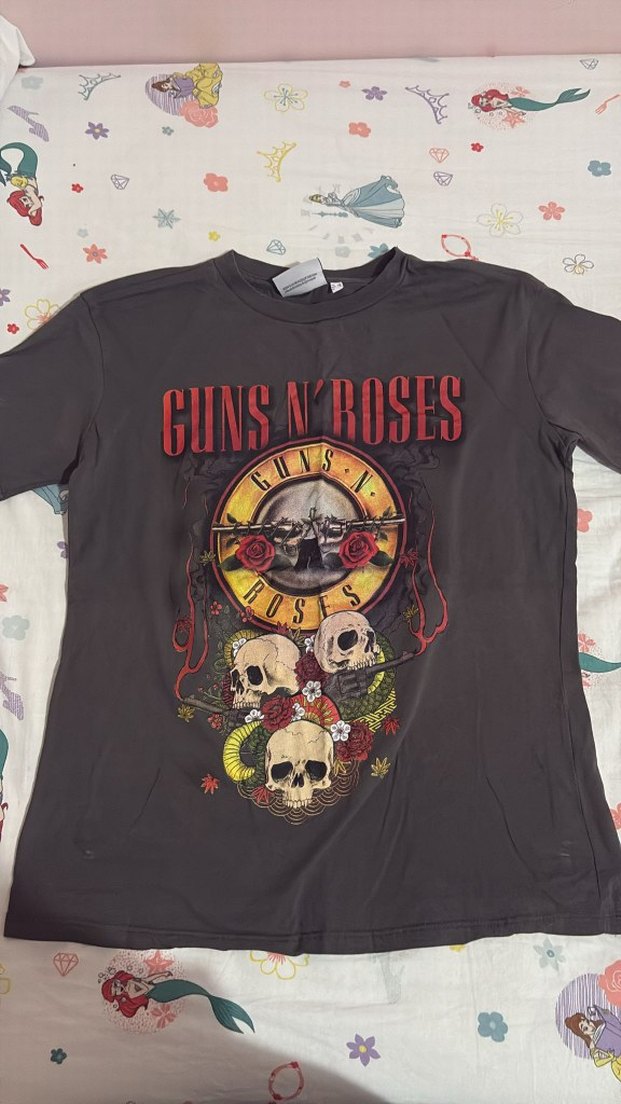 Gri renkli, pamuklu kadin tişörtü, yuvarlak yaka ve kisa kolludur. Gevşek kesim, baskılı ve düğme detaylıdır. Guns N' Roses logosu bulunur.