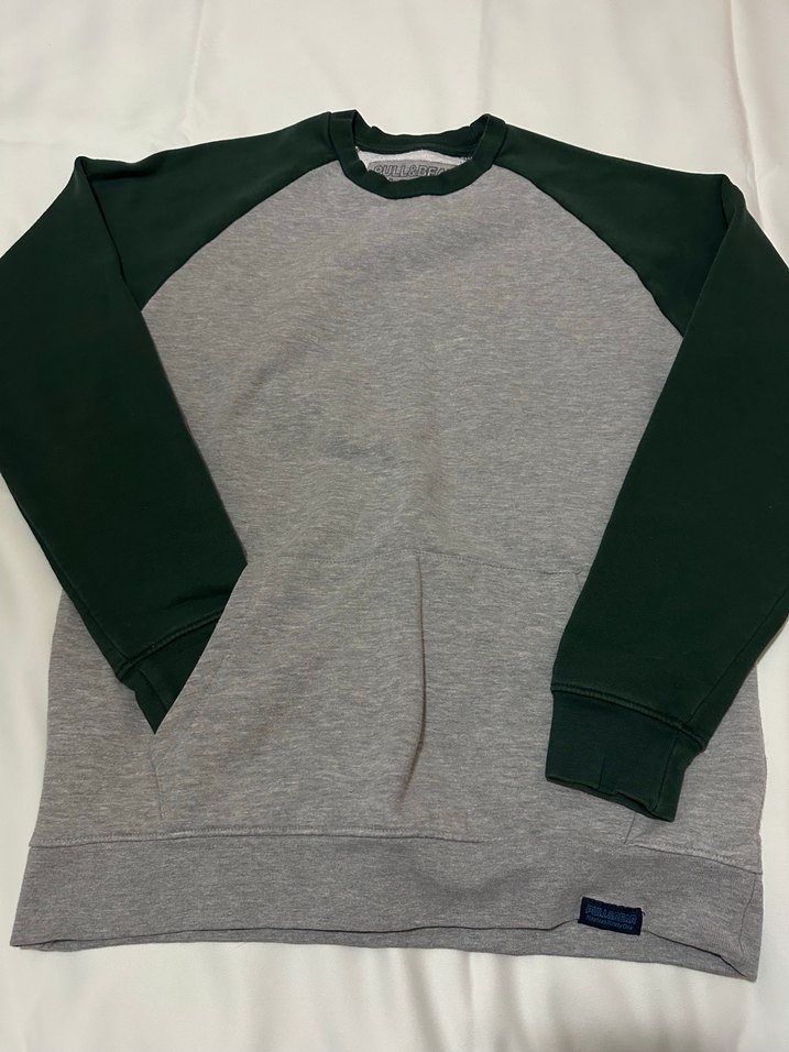 Gri gövde ve Haki Yeşil raglan kollu, yuvarlak yaka Unisex sweatshirt. Yumuşak ve sıcak kumaştan, bol kesim ve normal boyda, günlük sokak stili için uygundur.