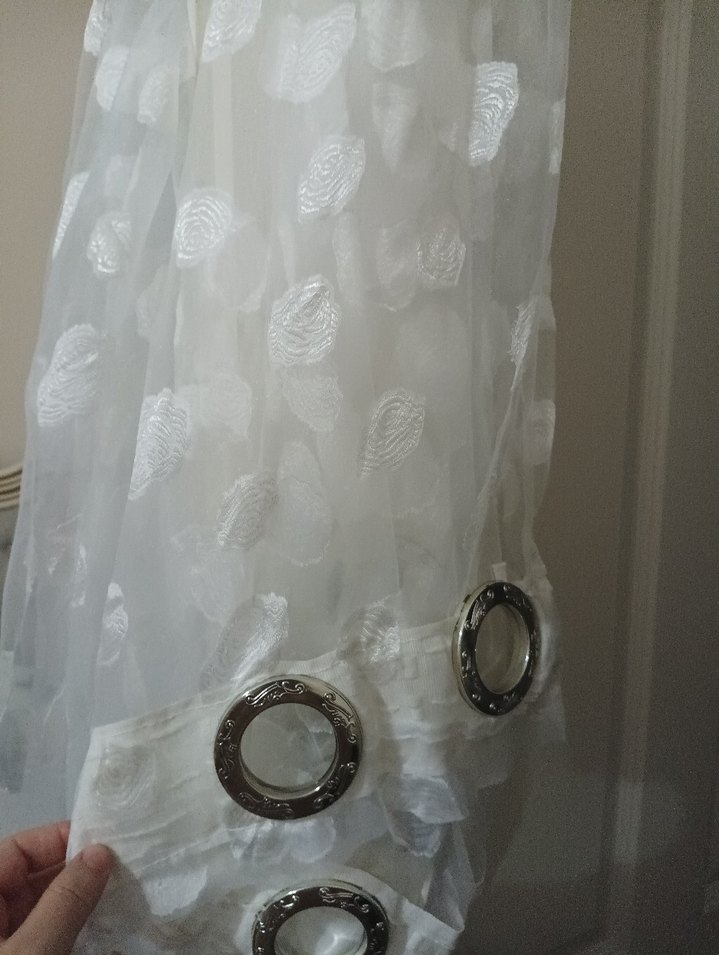 Gri metal halkalarla süslenmiş beyaz perde, modern ve çağdaş bir görünüm sunar.