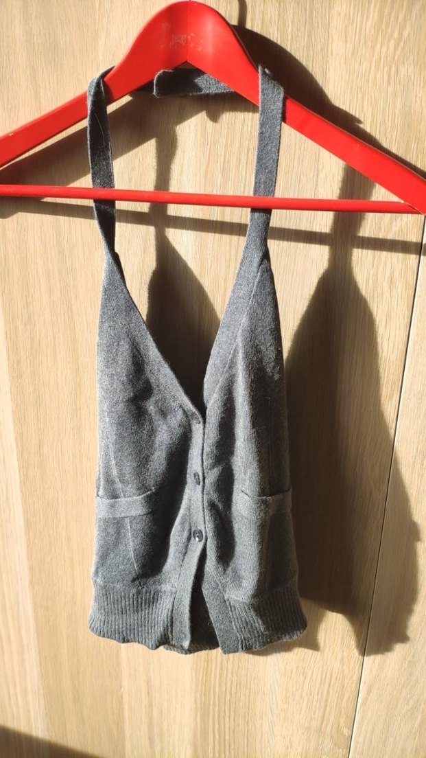 Gri renkli, halter yaka ve örme kumaştan yapılmış, vücuda oturan kadın yeleği. Kolsuz ve midi boyda, gündelik sokak stili için uygun. ✨