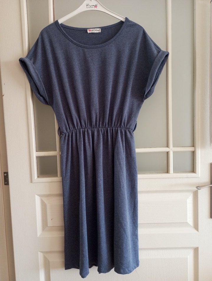 Gri renkte, kısa kollu, yuvarlak yakalı ve drapeli midi elbise, rahat ve bol kesimdir.
